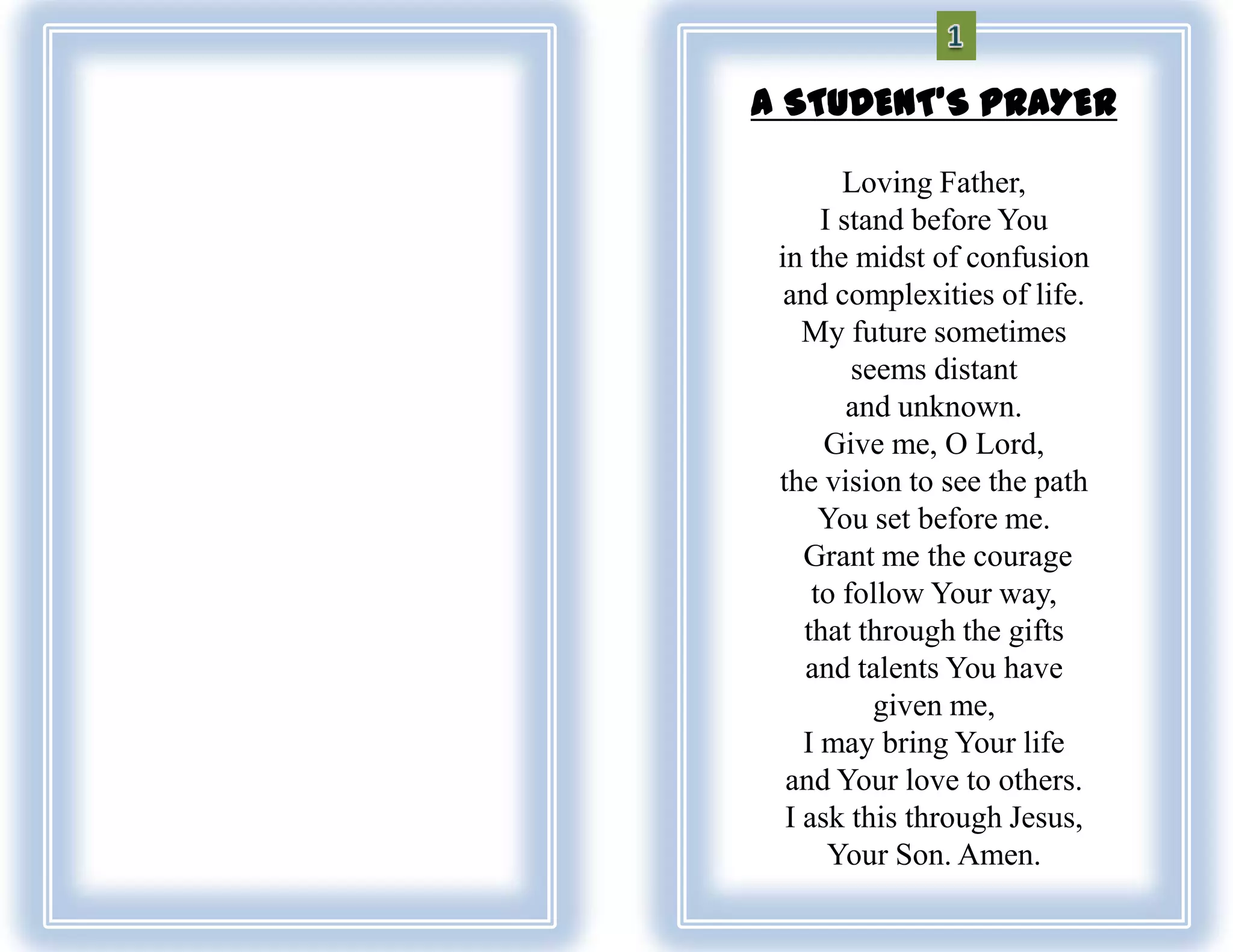 This prayer by St. Thomas Aquinas asks God for guidance and blessings as he prepares to study. He asks God to illuminate his understanding by removing the darkness of sin and ignorance. He prays for a keen mind, strong memory, ability to understand concepts fundamentally and express himself clearly. He asks God to direct the beginning, middle and completion of his studies, through Christ our Lord.