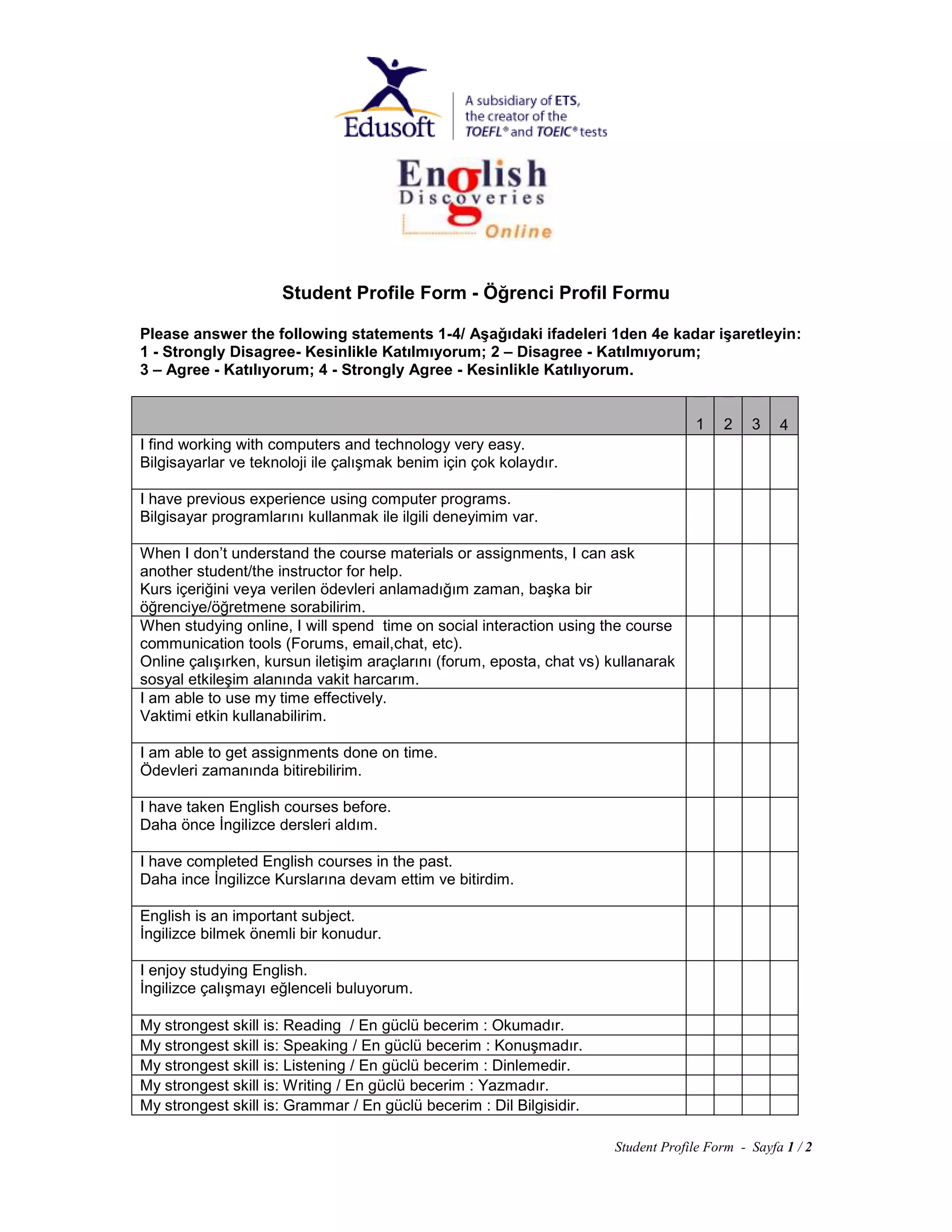 1 - Strongly Disagree- Kesinlikle Katılmıyorum; 2 – Disagree - Katılmıyorum;