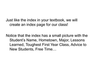 3) The profiles will be used to create an index for the class, while also being submitted privately to the instructor for review. The goal is for students to produce an honest yet quality reflection of their college experience and focus.