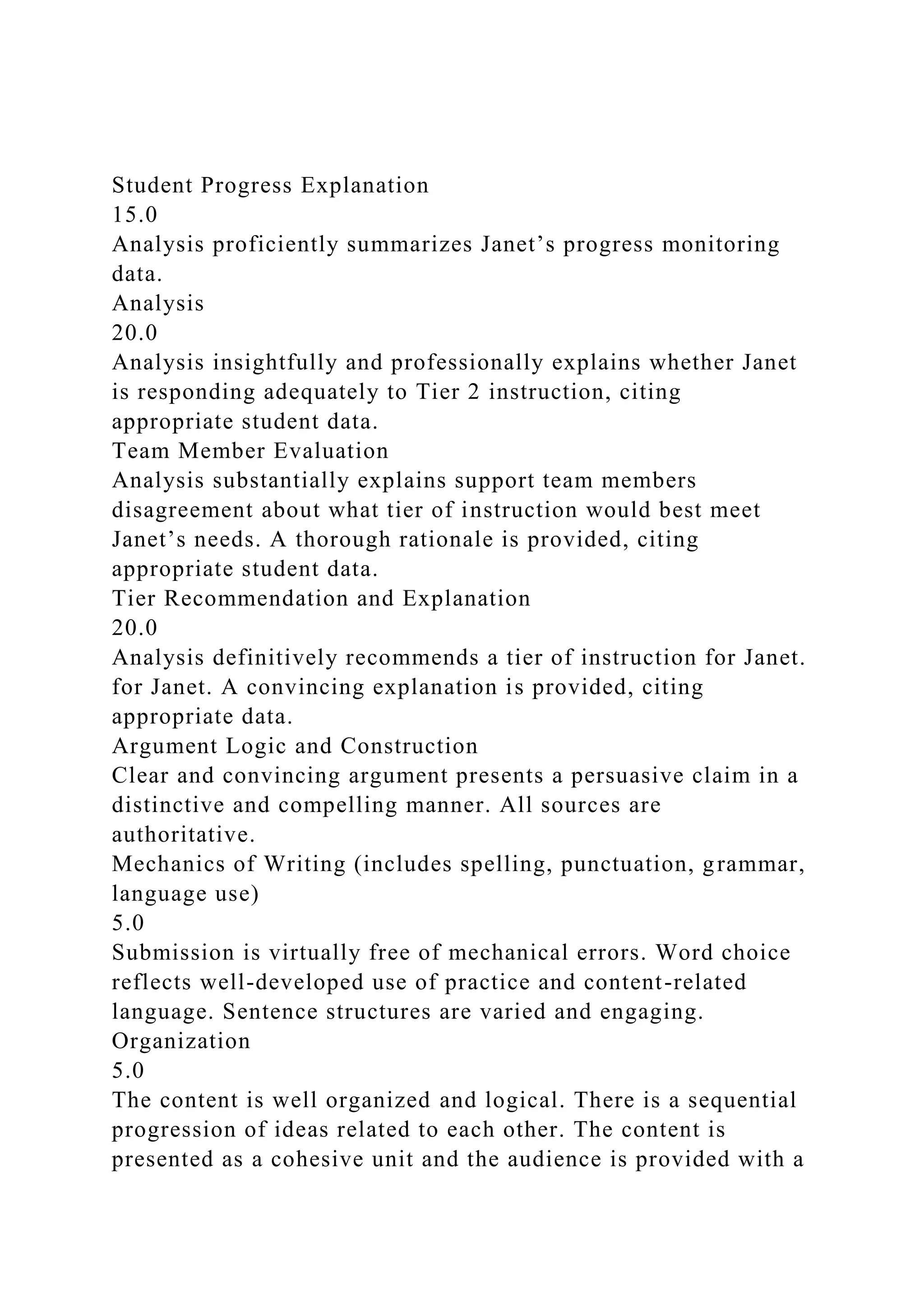 The document outlines an in-depth analysis of Janet's educational progress and the effectiveness of tier 2 instruction in improving her reading comprehension skills. It details the disagreements among the support team regarding the next steps for her instruction based on collected data, highlighting the importance of data-driven decisions in educational interventions. Additionally, it emphasizes the significance of proper health informatics in public health through the use of various technologies to address community health needs.