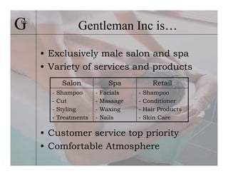 G Inc. is a male-exclusive salon and spa offering various services like haircuts, massages, skincare, and more, catering to image-conscious men aged 20-40. The business focuses on providing a comfortable atmosphere, high-quality service, and personalized customer care while capitalizing on the growing trend of male grooming. With a target market of 110,000 potential customers in the Greater Boston area, G Inc. aims to differentiate itself through service variety and a gentlemanly environment.