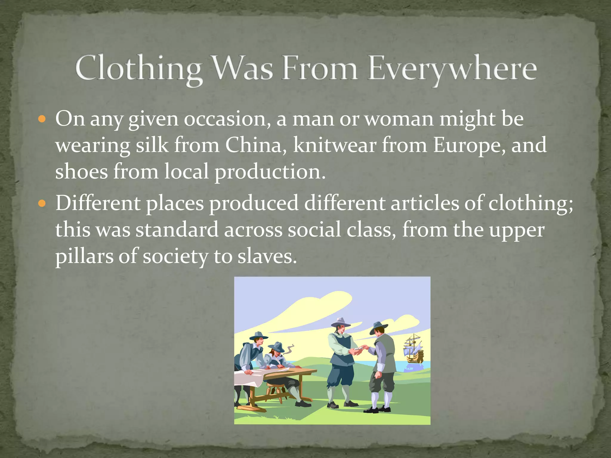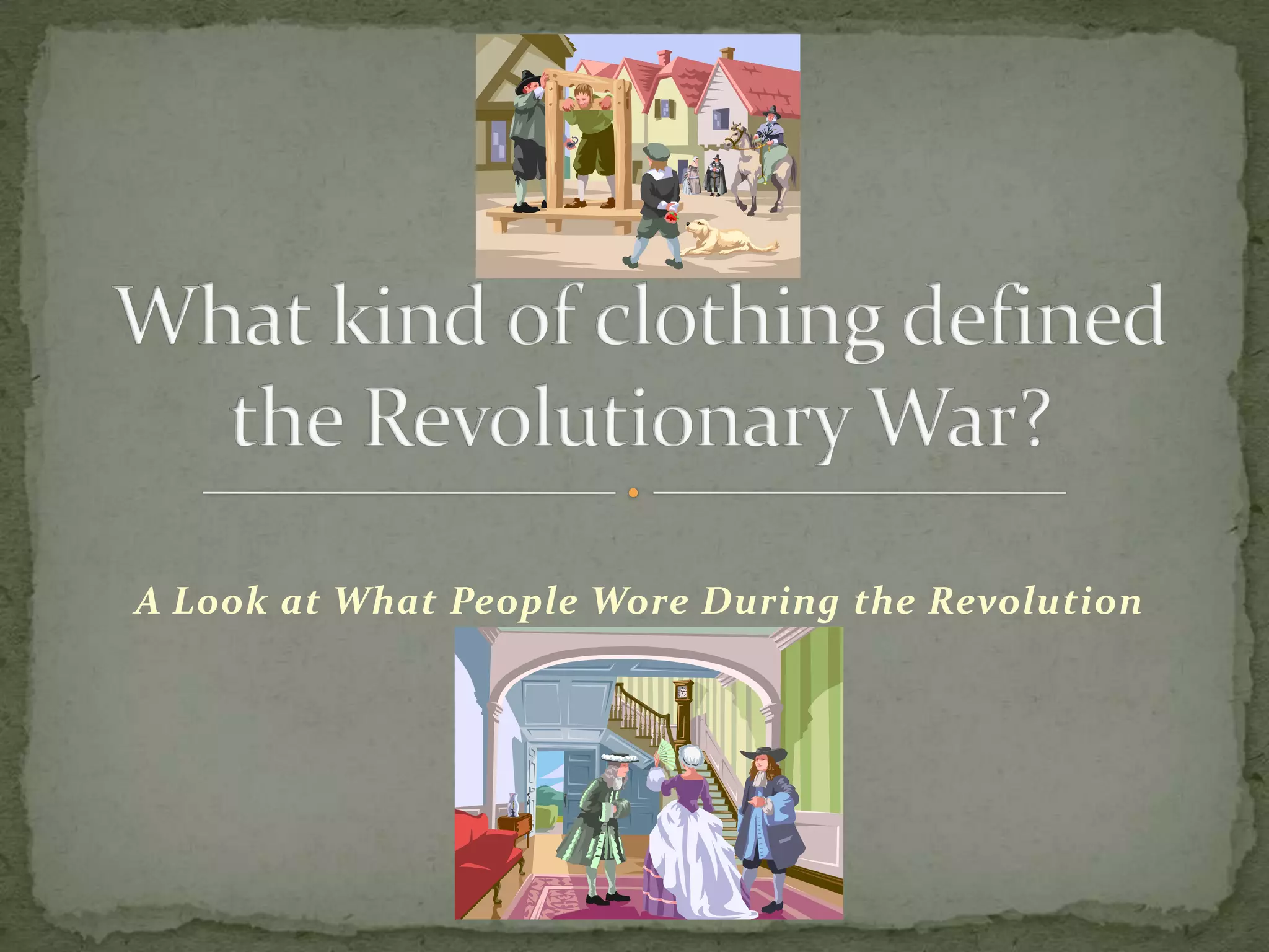 During the Revolutionary War period, clothing came from around the world and reflected social status and roles. Fine imported fabrics indicated wealth and power for both men and women. Soldiers uniforms aimed to appear organized and intimidating to enemies while common farmers and militiamen wore more practical clothes. Children wore gendered versions of adult clothing that evolved as they aged. Overall, clothing served as a form of personal expression and marker of identity.