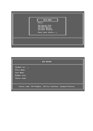 This document contains the source code for a student record management system created in C language. The system allows users to create a new record file, add student records, list all records, and exit the program. The source code includes functions for the main menu, record input/output, and basic formatting/navigation. It uses structures to store student data and file handling functions to read from and write to a text file for permanent storage of records.