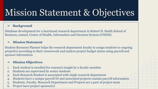 This document describes a student resource planner database created for the Center of Health, Information and Decision System research department. The database tracks students, courses, faculty, departments, projects and payroll information. It includes conceptual, logical and physical database designs along with sample queries and use cases. Functions like adding a new student or updating faculty information are demonstrated through screenshots.