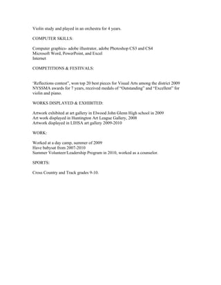 Sarah Brown is a recent high school graduate from Huntington, NY who demonstrates strong skills in visual arts, music, and leadership. She attained honors-level achievement including AP credits in drawing, photography, and science. Sarah held leadership roles at a summer camp and taught drawing lessons. Her extracurricular activities included yearbook club, religious youth group, dance, and community service. She has received specialized training and awards in painting, drawing, sculpture, photography, piano, and violin. Sarah's artwork has been displayed in school and community art galleries.