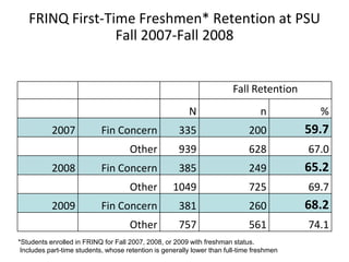This document provides findings on the retention rates and academic performance of first-time freshmen enrolled in the Freshman Inquiry course at Portland State University from 2007 to 2009. It highlights the impact of students' high school GPA, financial concerns, and living arrangements on their retention and academic success. The findings suggest that students with lower GPAs and those who are more financially concerned face greater challenges in retention and performance, prompting initiatives for enhanced support and resources.
