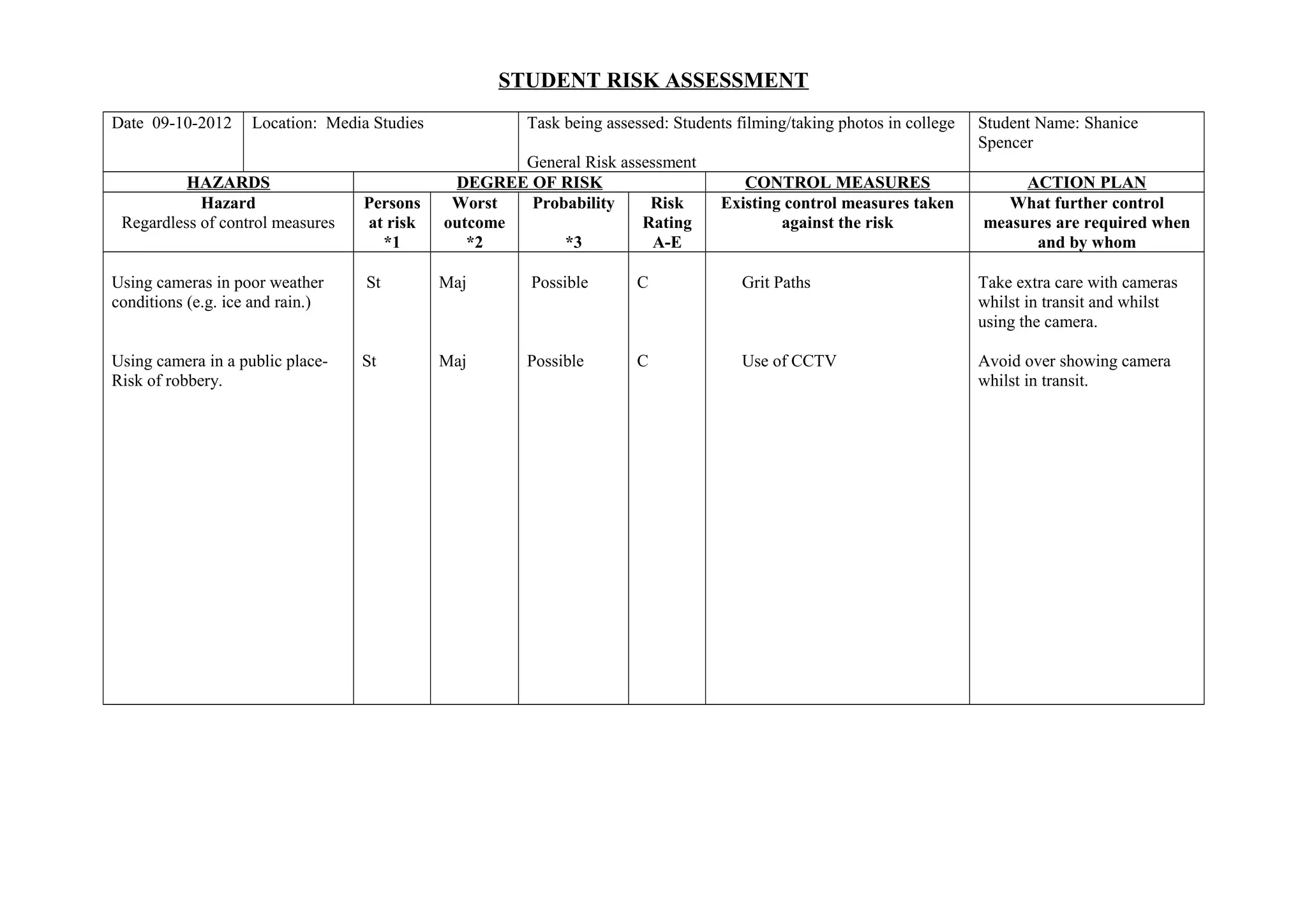 This risk assessment document evaluates risks students may face when filming or taking photos in college. It identifies hazards such as using cameras in poor weather conditions like ice and rain, and using cameras in public places where there is a risk of robbery. For each hazard, it rates the degree of risk by considering who may be affected, the worst possible outcome, and the probability of occurrence both with and without existing control measures. The document also includes an action plan to specify any further control measures needed to reduce risks.