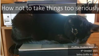 Selina Griffin, a second year EdD student, gave a seminar sharing lessons learned from her first year and tips for not taking things too seriously. She discussed getting a hobby, attending seminars, making space for reflection, not forgetting one's third party supervisor, and not taking everything so seriously. Attendees were invited to share examples and thoughts. Selina plugged her blog and contact details and asked participants to take away the importance of balance through non-academic activities and reflection.