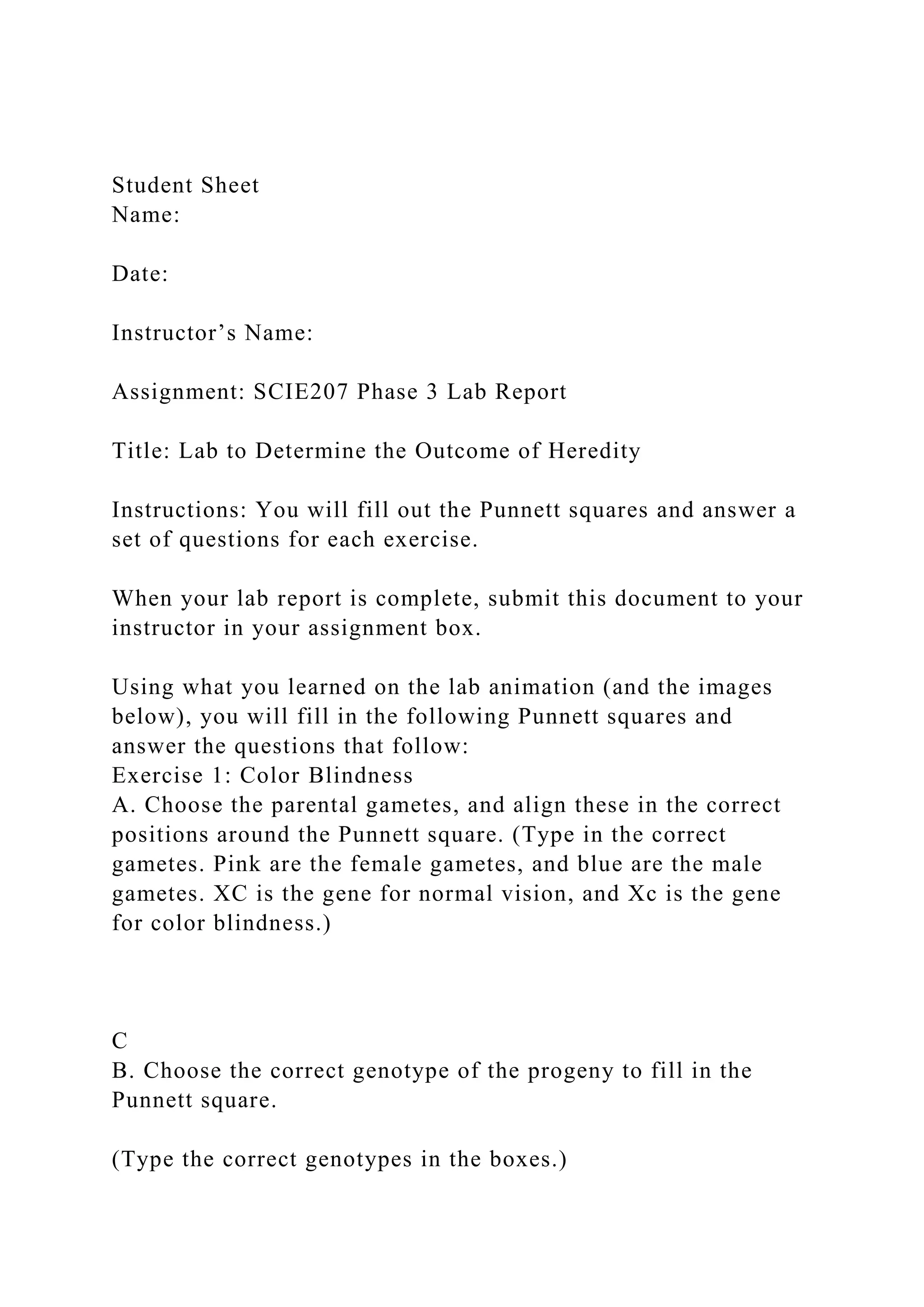 The document outlines a lab report assignment for students in a genetics course, focusing on using Punnett squares to determine inheritance patterns for color blindness, freckles, and blood types. Students are instructed to fill in parental gametes, genotype boxes, and answer questions regarding parental genotypes, possible phenotypes, and probabilities of traits in offspring. The assignment emphasizes understanding genetic principles and applying them to real-world scenarios, including a discussion on blood type inheritance and paternity claims.