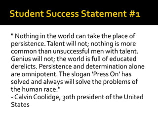 This document contains quotes from three sources emphasizing the importance of persistence. Calvin Coolidge asserts that persistence and determination are more powerful than talent or genius in achieving success. Herbert Kaufman states that persistence, when combined with courage and ambition, guarantees eventual success despite any failures along the way. Confucius argues that the failure to act on what one knows is right stems from a lack of courage.
