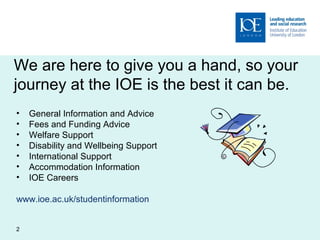 This document provides information about various student support services available at the IOE (Institute of Education). It discusses services like disability and wellbeing support, international student support, accommodation assistance, student funding and welfare, and access to University of London career and student services. Students can contact the IOE Student Support Centre for information, advice, and assistance regarding these various support offerings.