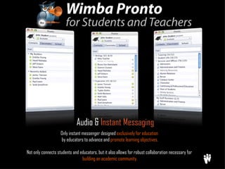 The document introduces an instant messaging platform designed for educational purposes that fosters collaboration between students and educators. It details steps for logging into Blackboard and using various tools, such as bookmarking resources and receiving course updates via a Facebook app. Additionally, it provides information about online access to course materials and text messaging alerts for important updates.