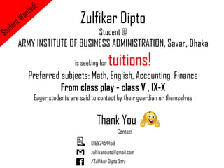 Zulfikar Dipto, a student from the Army Institute of Business Administration in Dhaka, is offering tutoring services in math, English, accounting, and finance for students from preschool to class X. Interested students or their guardians can contact him via phone or email for arrangements. The advertisement seeks eager learners for academic support.