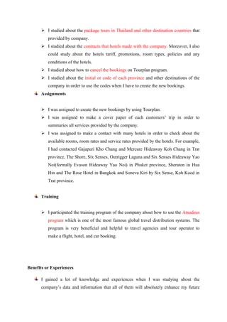 The student worked as an intern at Exotissimo Travel in Thailand for 2 months. During the sixth week, she studied the company's pricing plans, product surveys, travel elements, package tours, and hotel contracts. She was assigned to make new bookings and summarize customer trips. The student also contacted hotels to check availability and rates. She participated in Amadeus training but there was no computer for practice. Issues included lacking a computer, not enough work assignments, and delays contacting hotels for rates. The student believed more hands-on training and work assignments would benefit her learning experience.