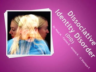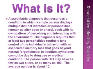 Dissociative Identity Disorder (DID) is a psychiatric diagnosis where a person displays multiple distinct identities or personalities, each with their own memories and patterns of behavior. DID is caused by severe childhood trauma like abuse and neglect. The child dissociates or splits their identity as a coping mechanism. Symptoms include memory loss, depression, hallucinations, and an inability to account for certain events. Treatment focuses on psychotherapy to help integrate the different personalities. DID is difficult to treat and prognosis depends on comorbid conditions and ability to remove oneself from abusive situations.