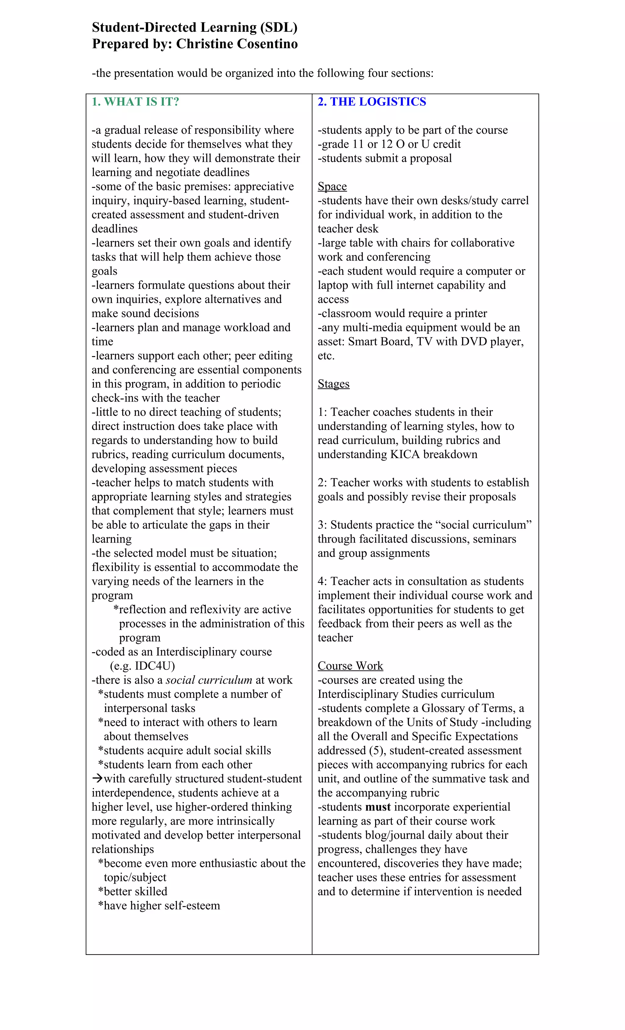 This document provides information about a Student-Directed Learning (SDL) course. The SDL model allows students to decide what they will learn, how they will demonstrate their learning, and negotiate deadlines. Students set their own goals, identify tasks to achieve those goals, and support each other through peer editing and conferencing. The teacher coaches students and helps match them with appropriate learning strategies. Research shows SDL fosters personal growth, helps students learn for specific use of knowledge, and develops attributes of character. An example SDL program from Bradford High School is described which guides students through the SDL process.