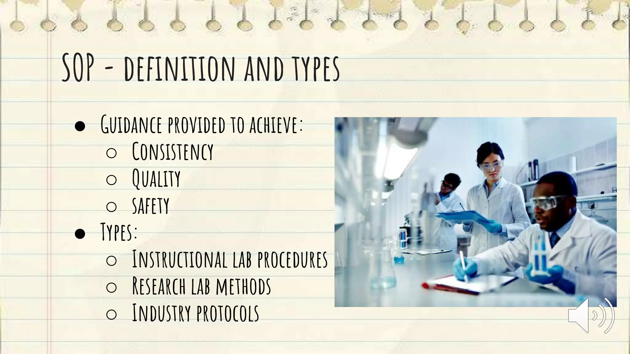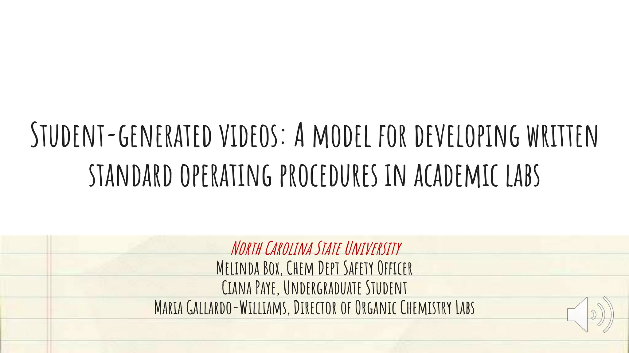 The document discusses the development of standard operating procedures (SOPs) in academic labs through student-generated videos at North Carolina State University. It emphasizes the importance of instructional design, audience engagement, and the use of story structure to create effective training tools. The document outlines best practices for creating SOPs, such as collaboration, user involvement, and the authentication of content.
