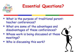 The document discusses the implementation and benefits of student-led conferences, where students lead discussions about their work and progress with their families, shifting the teacher's role to that of a facilitator. These conferences enhance student responsibility for learning, involve families more actively, and provide opportunities for personal reflection and goal setting. The text outlines the roles of students, families, teachers, and administrators in these conferences, as well as tips for preparation and potential portfolios contents.