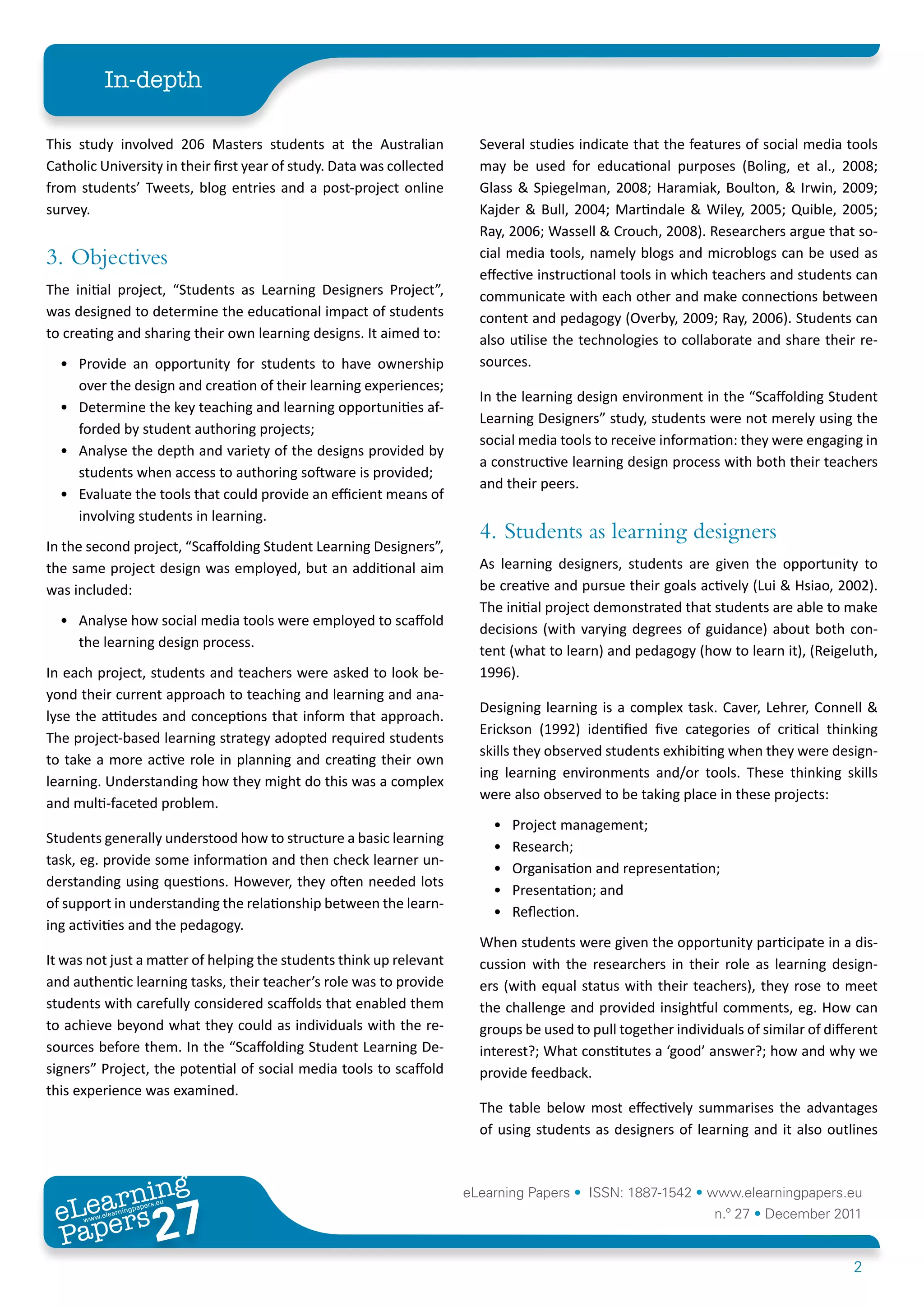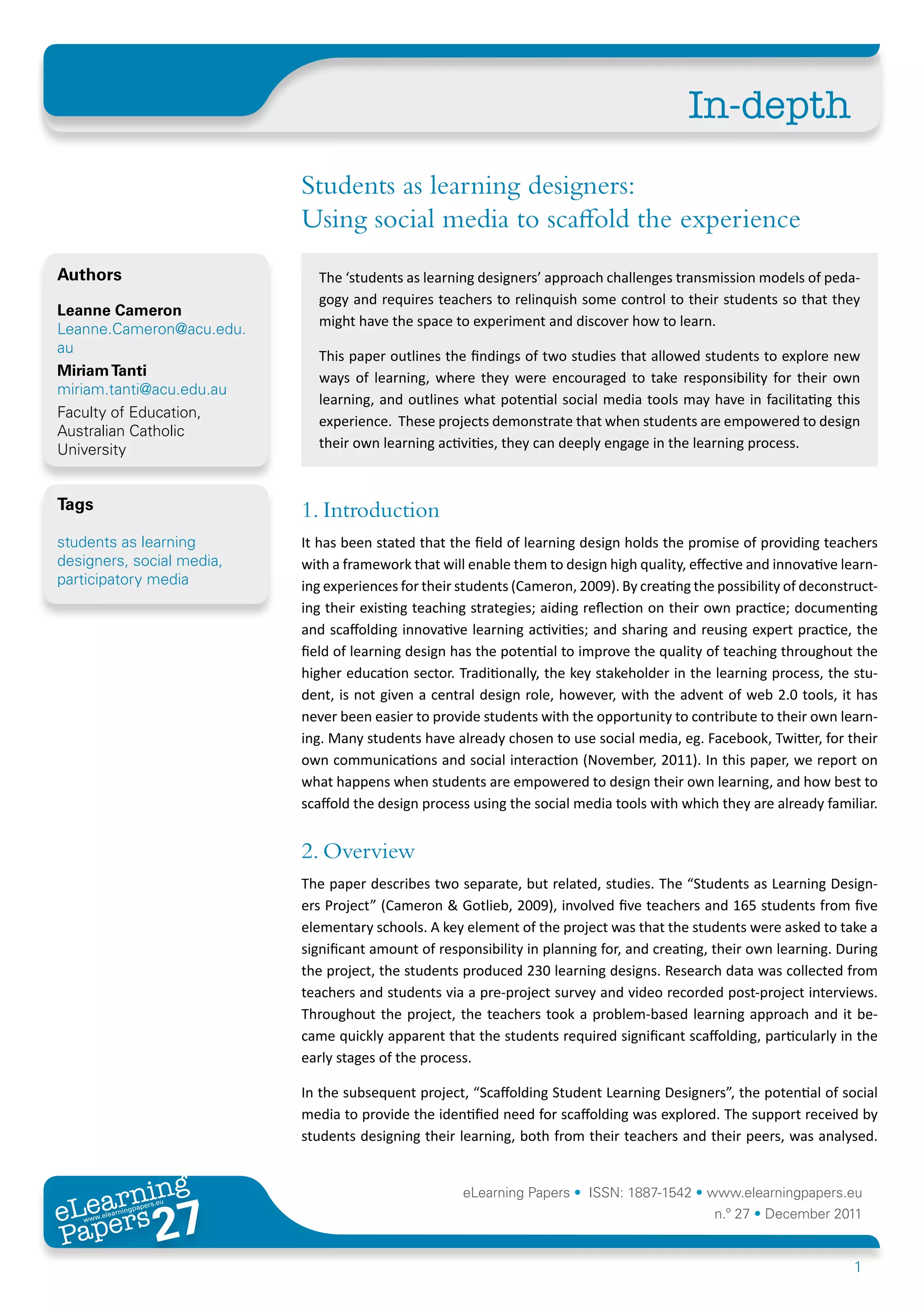 This document discusses the 'students as learning designers' approach, which empowers students to take control of their learning through the use of social media tools. It outlines findings from two studies where students engaged in creating their own learning designs, demonstrating the potential for deeper engagement and collaboration. The research emphasizes the importance of scaffolding and support from teachers to enable effective student-led learning experiences.