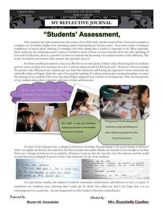 This journal entry discusses the author's reflections on their four remaining weeks of student teaching. It explores how student assessments, achievements, and behavior impact the author's development as a teacher. The author finds student test scores and behavior motivational, but acknowledges two months is not enough time to see changes in behavior. The author hopes being affected by students encourages further growth into a capable educator.