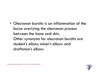 Olecranon bursitis, also known as student's elbow, is an inflammation of the bursa located over the olecranon process, often due to trauma, repetitive rubbing, or underlying medical conditions. Diagnosis includes ruling out fractures and ligament injuries, while treatment varies from conservative measures like rest and NSAIDs to surgical intervention in chronic cases. Physical therapy may aid recovery, and techniques like phonophoresis can enhance treatment effectiveness.