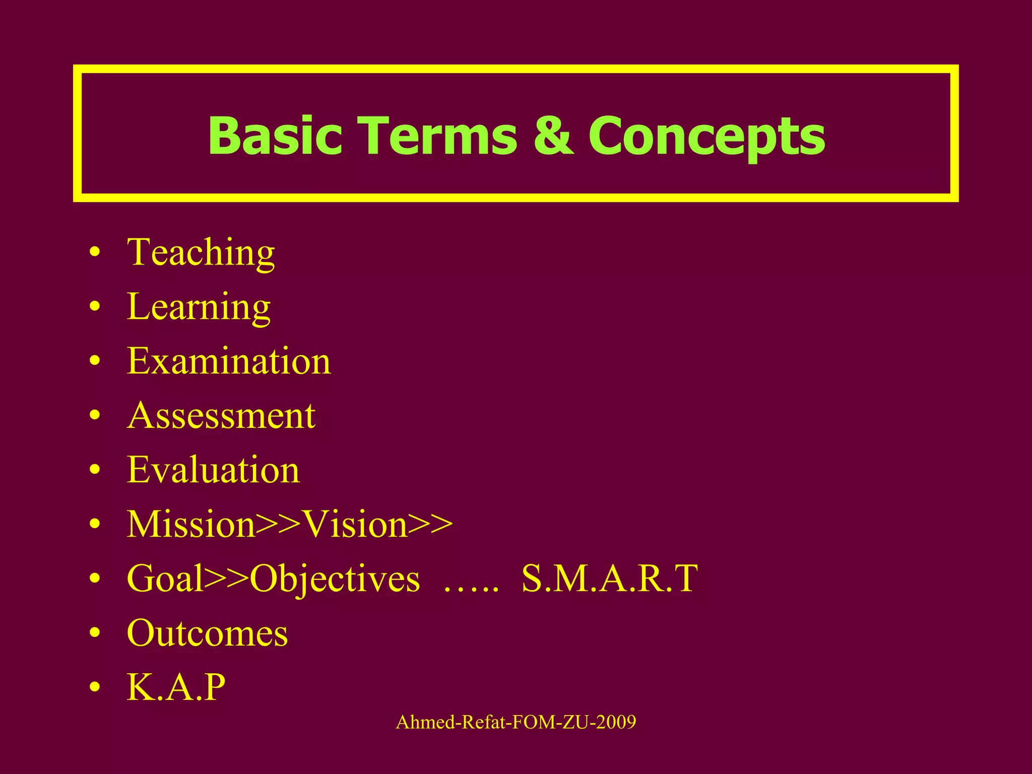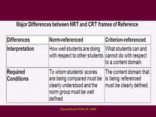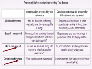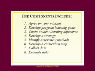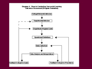 The document discusses key concepts related to teaching, learning, and assessment. It provides definitions and explanations of important terms like objectives, outcomes, assessment, evaluation, formative and summative assessment, and direct and indirect assessment methods. It emphasizes that the primary purpose of assessment is to improve student learning and that assessment should be connected to learning objectives and used to evaluate and enhance teaching, learning, and programs.
