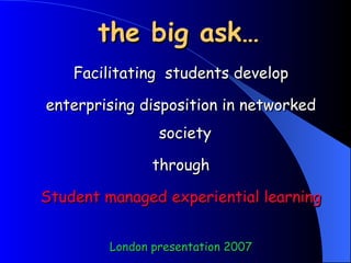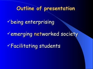 The document discusses facilitating students' enterprising disposition in a networked society through experiential learning, highlighting the importance of skills, support, and access. It emphasizes the characteristics of being enterprising, including initiative, resourcefulness, and adaptability in the face of change. The presentation also explores teaching methodologies that empower students, positioning them as directors of their learning projects while engaging with real-world enterprise applications.
