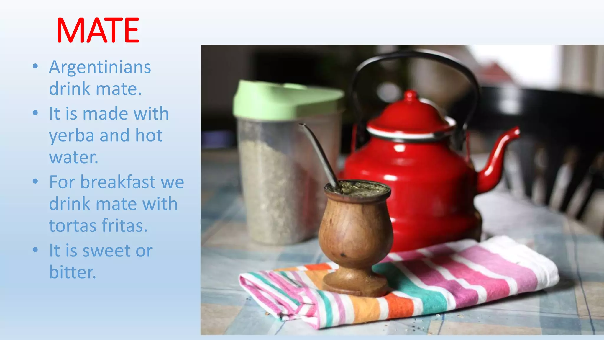 The document describes common foods eaten in Argentina, including mate (a tea made with yerba mate leaves and hot water), milanesa (breaded meat, fish or chicken), empanadas (filled pastries), pasta, locro (a stew of beans, vegetables and meat), choripan (a sausage sandwich), and asado (grilled meat). Many of these foods are eaten for lunch or dinner, though mate and empanadas may also be consumed for breakfast. Key ingredients include meat, breading, tomatoes, potatoes, carrots, beans and cheese. Cooking methods include baking, frying and grilling.