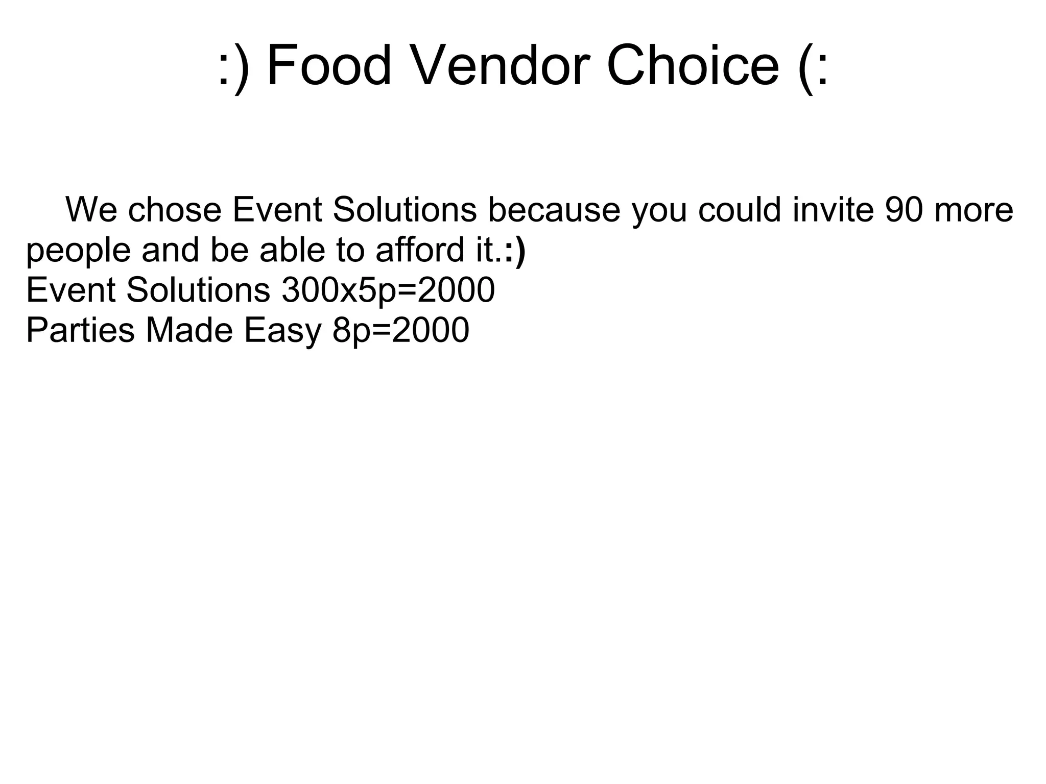 The document discusses a comparison between two food vendors, Event Solutions and Parties Made Easy, highlighting that Event Solutions allows for 90 additional guests within the budget. It also compares party rental companies, suggesting Acme Party Rentals for its better offer of 5 hours vs. 4 hours. Lastly, it briefly mentions options for music services without detailed analysis.