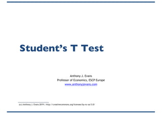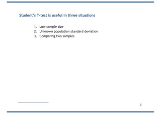 The document discusses Student's t-test, which is useful for three situations: when sample sizes are small, when the population standard deviation is unknown, and when comparing two samples. It describes how Student's t-test addresses the problems with small sample sizes that violate the Central Limit Theorem. It also explains how the t-test can be used to estimate an unknown population standard deviation from the sample standard deviation. Finally, it provides examples of using a t-test to compare the means of two samples and of using a paired t-test to compare salaries between two cities for the same jobs.
