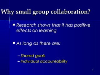 This document discusses the benefits of small group collaboration among students when done effectively. It notes that research shows collaboration can positively impact learning as long as groups have shared goals and individual accountability. However, some teacher styles have reduced the quality and quantity of student discussion. The document then outlines techniques to promote effective small group discussions, including establishing ground rules and analyzing different types of student talk. The goal is to help students build on each other's ideas and reasoning through exploratory talk rather than simply disputing or confirming ideas.