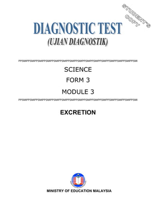 This document is a science module on excretion for Form 3 students. It contains 35 multiple choice questions testing students' understanding of excretion in the human body and plants. The questions cover the key excretory organs like the skin, lungs, and kidneys and their functions. It also addresses waste transport and removal through the urinary system.