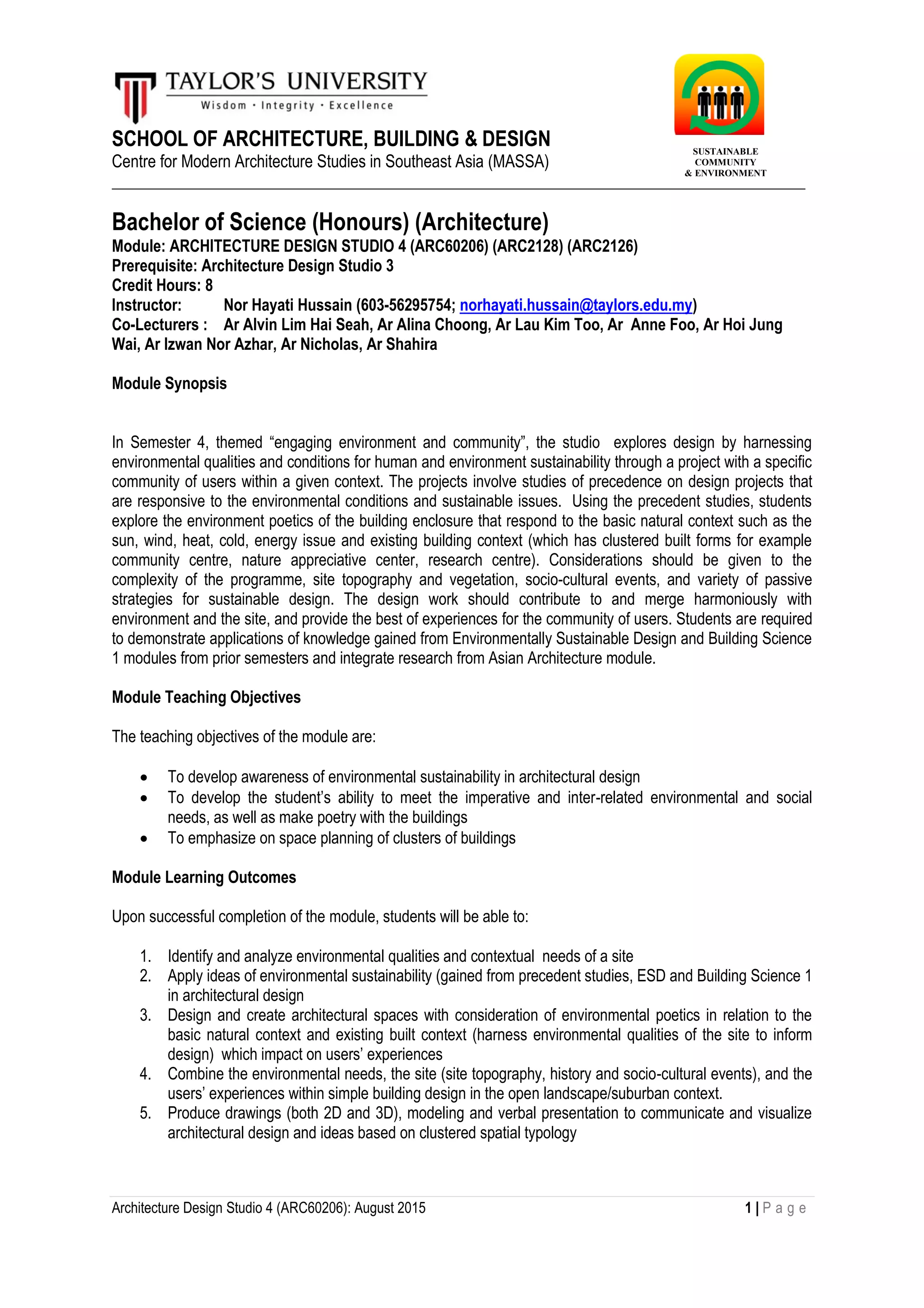 This document provides information about the Architecture Design Studio 4 module taken by Bachelor of Science (Honours) in Architecture students. The module focuses on designing for environmental sustainability and community engagement through a project for a specific community within a given context. Students will explore precedent studies and design solutions that harness environmental qualities and conditions. Assessments include two design projects and a Taylor's Graduate Capabilities portfolio. The projects require consideration of environmental, social, and programmatic needs and utilize passive design strategies. Upon completing the module, students will be able to analyze site contexts, apply sustainability principles, and design architectural spaces that respond to environmental and user needs through clustered building typologies.