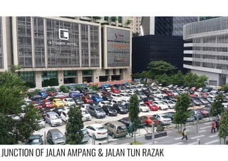 This document provides a historical timeline and context for the junction of Jalan Ampang and Jalan Tun Razak in Kuala Lumpur, Malaysia. It outlines the macro and micro history of the area from the 1850s to present day, including key events, development milestones, and changes in architectural style over time. The document also includes maps and diagrams showing land use zoning, daily activity patterns at different nodes in the area, transportation routes, and shadow casting patterns at different times of day.