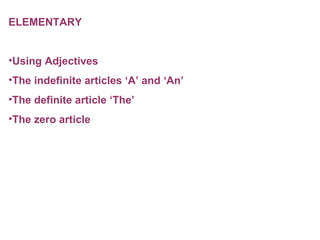 This document discusses the use of adjectives and articles in English. It explains that indefinite articles like "a" and "an" are used to describe something for the first time, while the definite article "the" is used when referring to something unique or mentioning it again. It provides examples of when to use "a", "an", and "the" depending on whether the following word begins with a vowel or consonant sound.