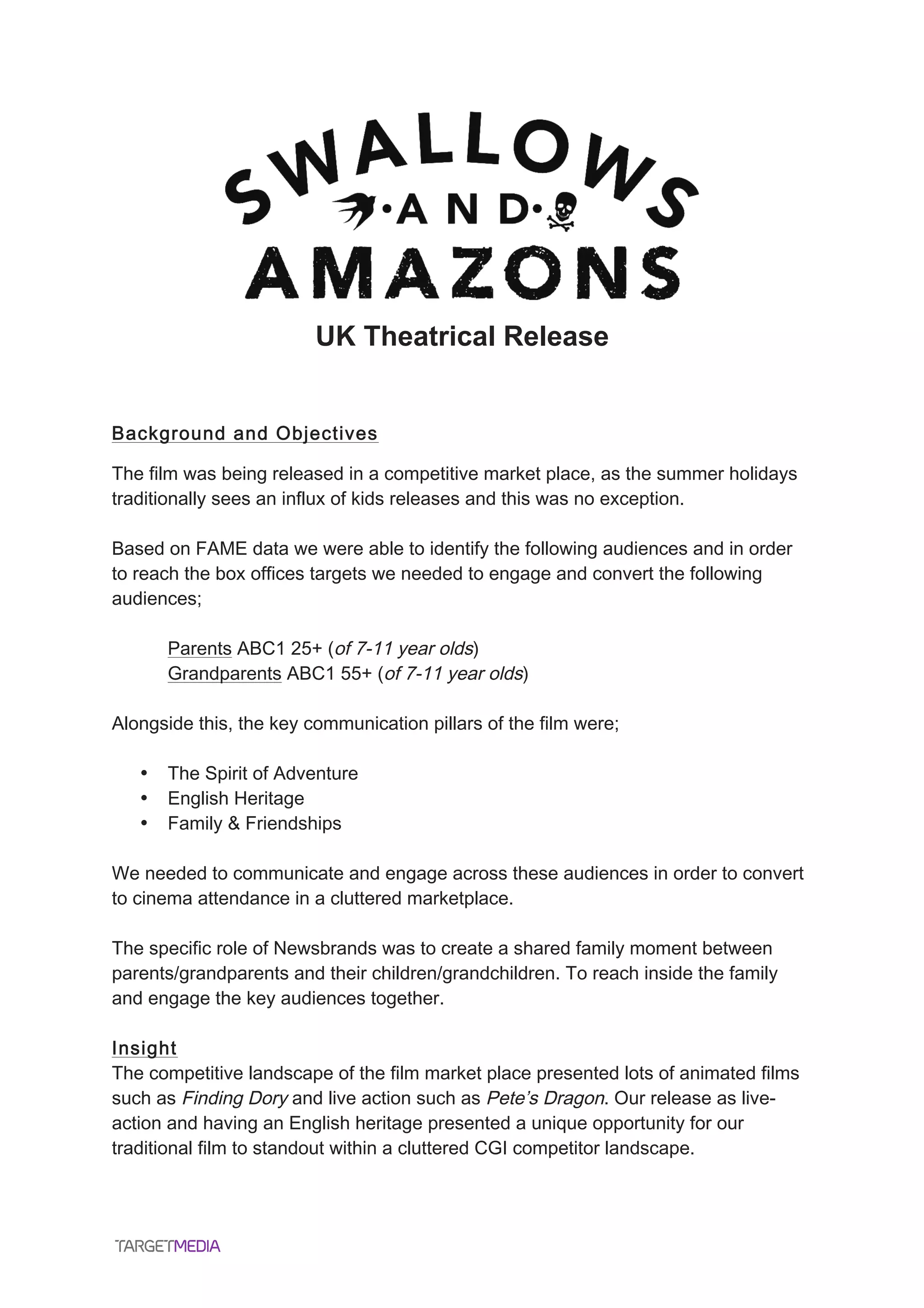The document discusses the release strategy for a live-action film in a competitive market, focusing on engaging families, particularly parents and grandparents, to drive cinema attendance. Key communication pillars included adventure, heritage, and family connections, with innovative promotions such as a craft activity featured in the Telegraph to foster family interaction. The campaign exceeded box office expectations, demonstrating that traditional newsbrands can successfully engage younger audiences and create memorable family experiences.