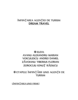 Documentul detaliază etapele necesare înființării agenției de turism 'Dream Travel', inclusiv înregistrarea firmei, obținerea licenței și crearea identității agenției. Aceasta va funcționa ca o societate pe acțiuni, având ca obiectiv principal creșterea cifrei de afaceri cu 30% și asigurarea de servicii turistice de înaltă calitate. Agenția își propune să devină un consultant de încredere pentru clienți, respectând legislația națională și europeană.