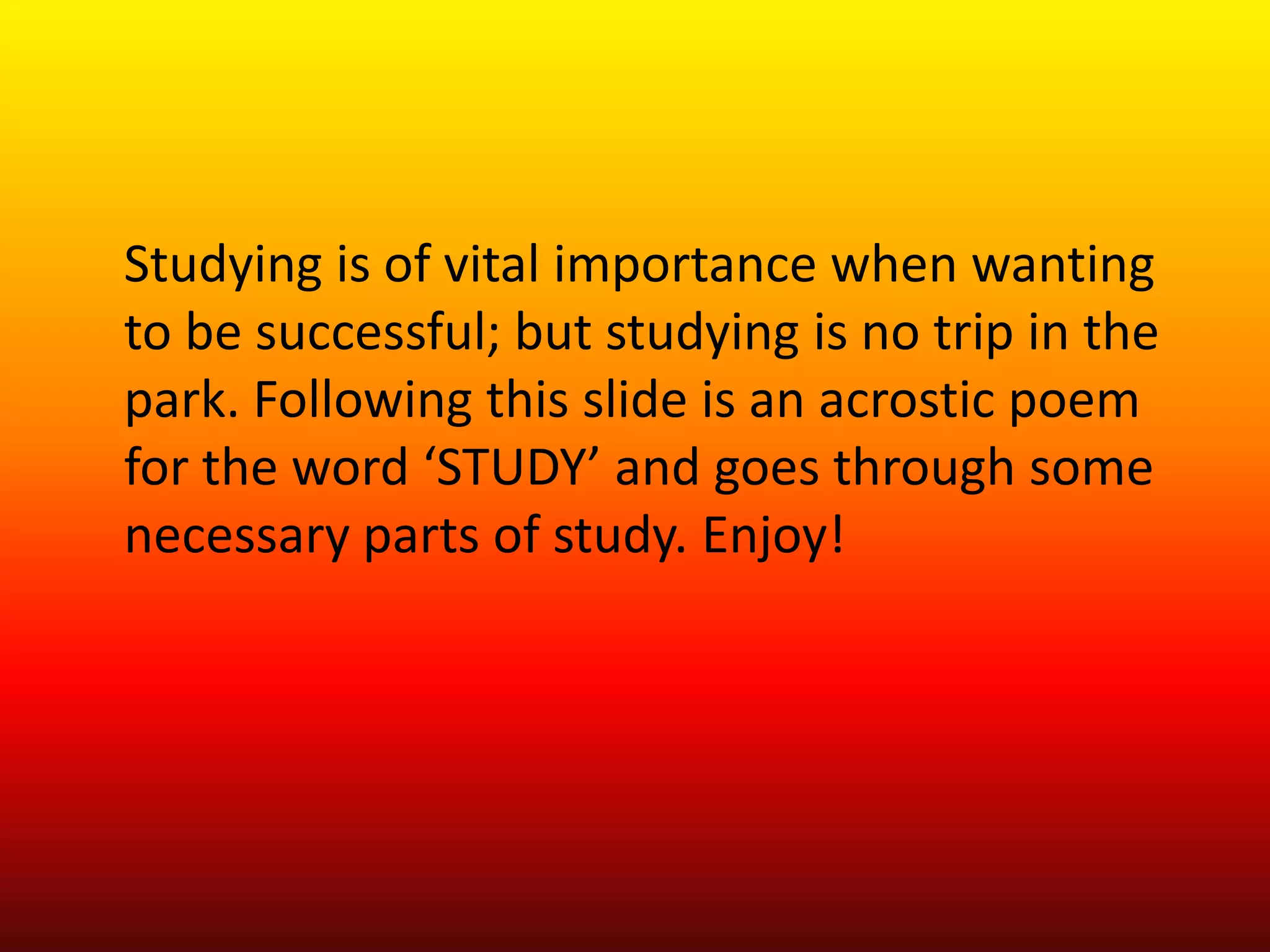 The document emphasizes the importance of studying and offers strategies for effective study habits through an acrostic poem for the word 'study'. Key components include the necessity of dedicating time, utilizing resources, exploring various study methods, and creating organized summary notes weekly. Overall, it highlights that success in studies requires hard work, sacrifice, and effective organization.