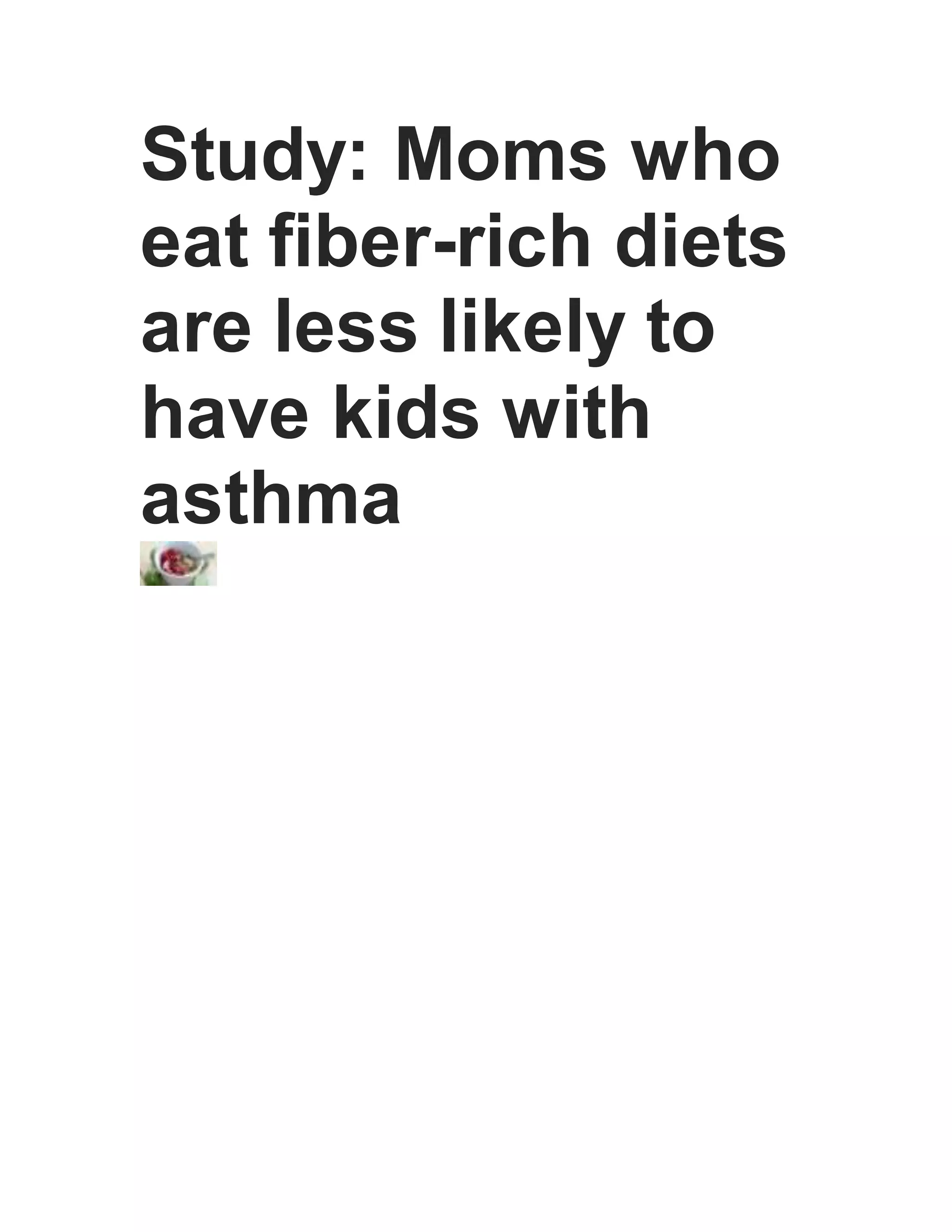 1) A study found that mice fed a high-fiber diet were less likely to develop allergic airways disease (AAD), which is similar to asthma, and their offspring also did not develop AAD even when switched to a normal diet.