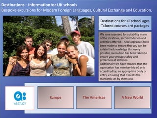 The document outlines bespoke excursions and study abroad programs for UK schools, focusing on modern foreign languages and cultural exchanges in various international destinations. It emphasizes the importance of language immersion, safety, and personalized services tailored to student needs, offering courses in multiple languages and activities. Additionally, it provides information on travel arrangements, risk management, and the experience of the providers involved in delivering quality educational programs.