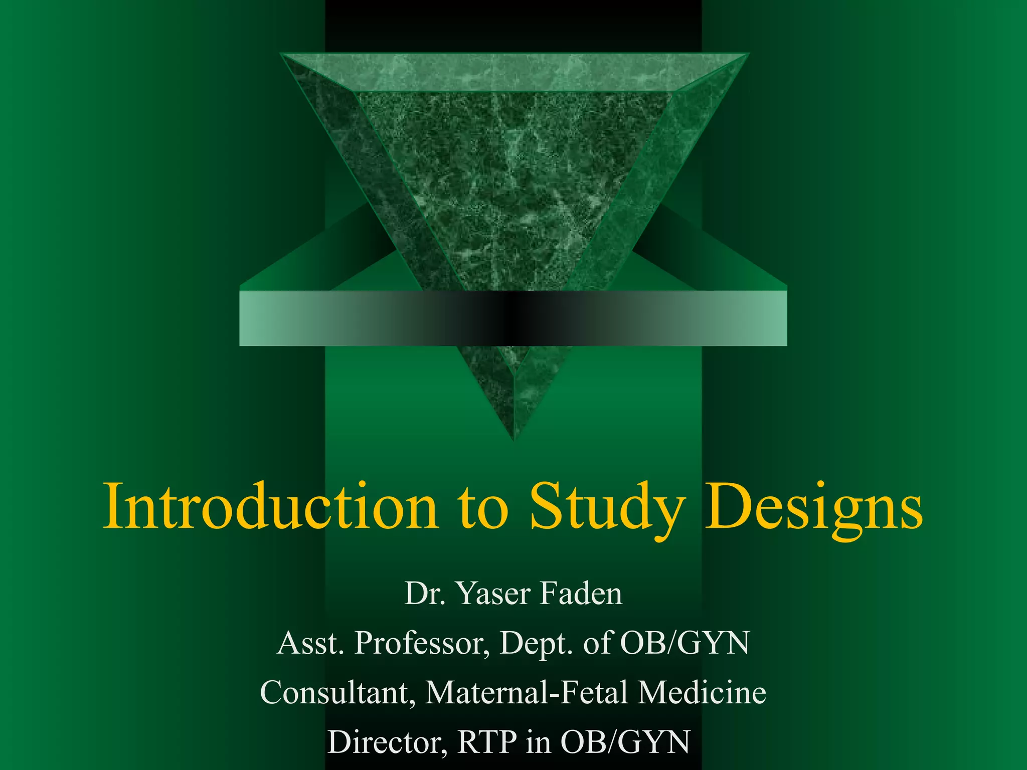 This document provides an overview of different study designs used in epidemiology and biomedical research. It begins by distinguishing between observational and experimental studies. The main types of observational studies covered are case-control, cohort, cross-sectional, and ecological studies. Experimental studies discussed are randomized controlled trials. Key characteristics, advantages, and disadvantages of each study design are outlined. Examples are provided to illustrate concepts.