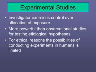 This document describes different types of medical studies, including observational and experimental studies. It provides details on clinical trials, noting that they are the gold standard as they provide the greatest justification for concluding causality. The document outlines different types of observational studies like descriptive, analytical, cross-sectional, longitudinal, retrospective, and prospective studies. It also explains key aspects of experimental studies like clinical/community trials, with details on samples, randomization, interventions, controls, and measuring outcomes.