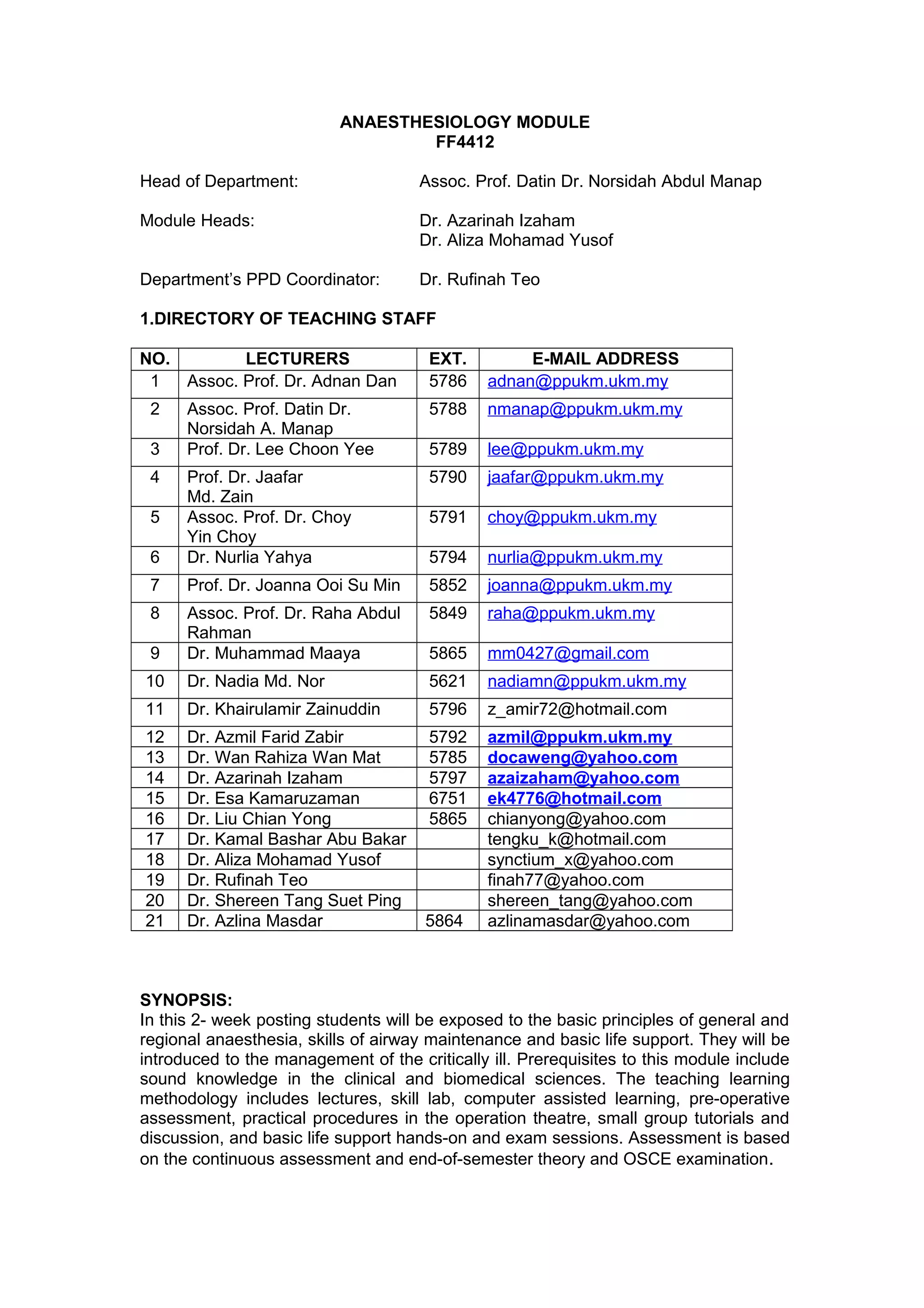 - The module heads and coordinators, as well as a directory of teaching staff.