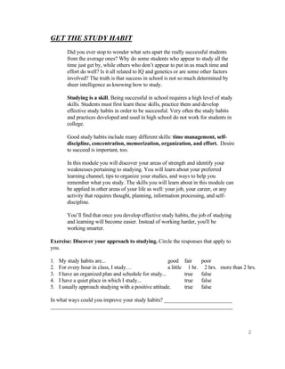 This document provides tips and strategies for developing effective study habits. It discusses identifying your preferred learning style (visual, auditory, kinesthetic), scheduling daily and weekly reviews of course material, finding your optimal study times and places, and organizing your study materials and environment. The goal is to help students make studying more efficient and effective through developing strong time management, organization, and self-discipline skills.