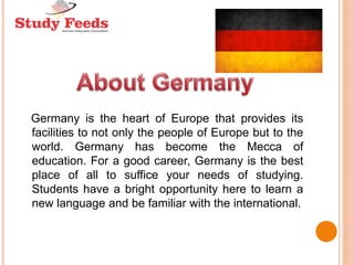 Germany provides high quality and affordable education opportunities for both domestic and international students. It has over 300 higher education institutions and offers degree programs in fields like engineering, medicine, law, and languages. Studying in Germany offers benefits such as no tuition fees, low living costs, opportunities for scholarships and part-time work. Requirements for admission include academic documents, a valid passport, proof of financial support, and health insurance accepted by the chosen university.