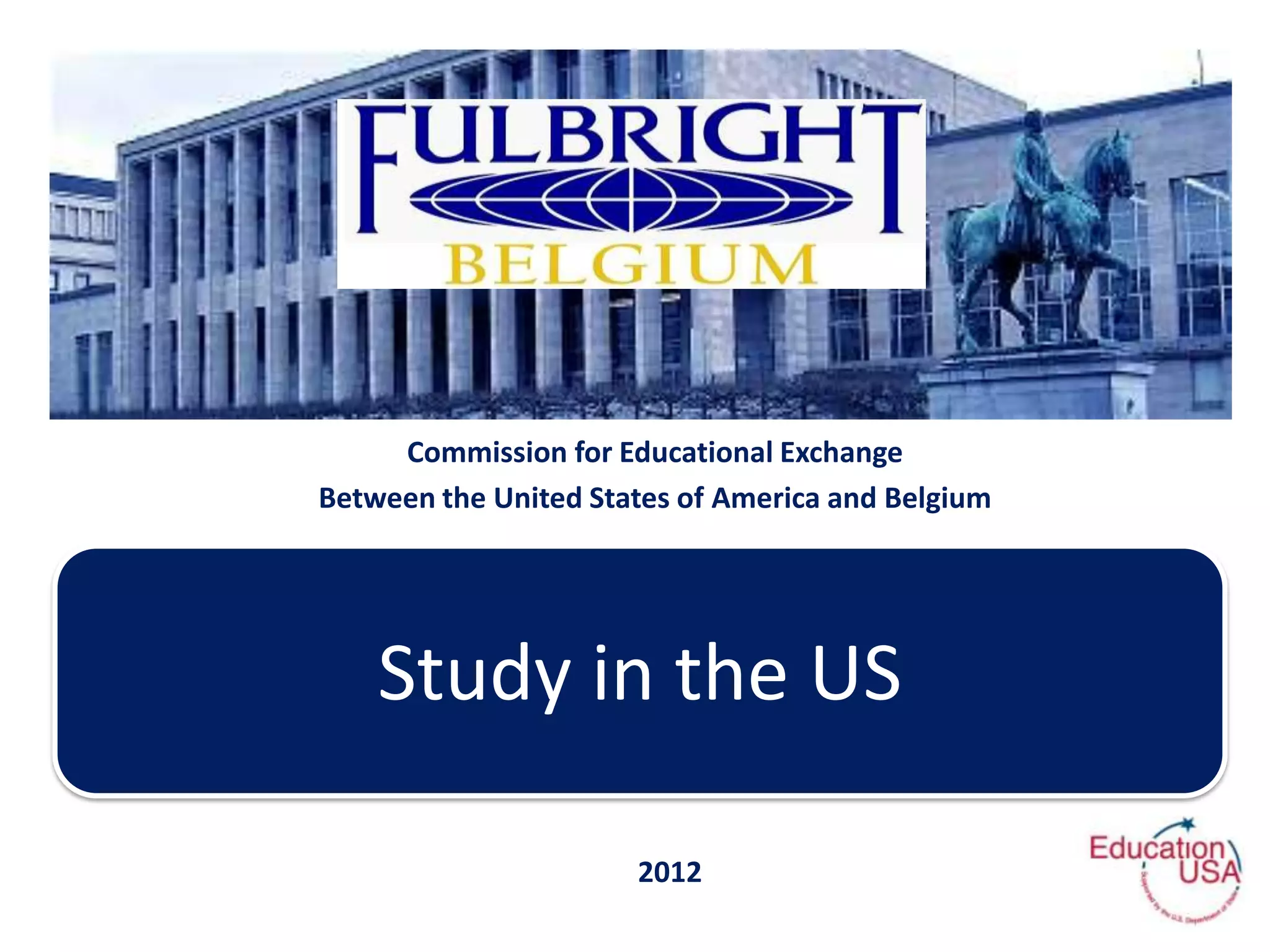 The Commission for Educational Exchange Between the United States and Belgium provides information to help Belgian students study in the US. It outlines the application process which includes choosing 5-10 universities, determining program requirements, and taking necessary tests like TOEFL over 12-18 months. It also discusses financing options like scholarships, fellowships, and loans. The document provides tips on researching programs, differences between undergraduate and graduate studies, and important application deadlines.