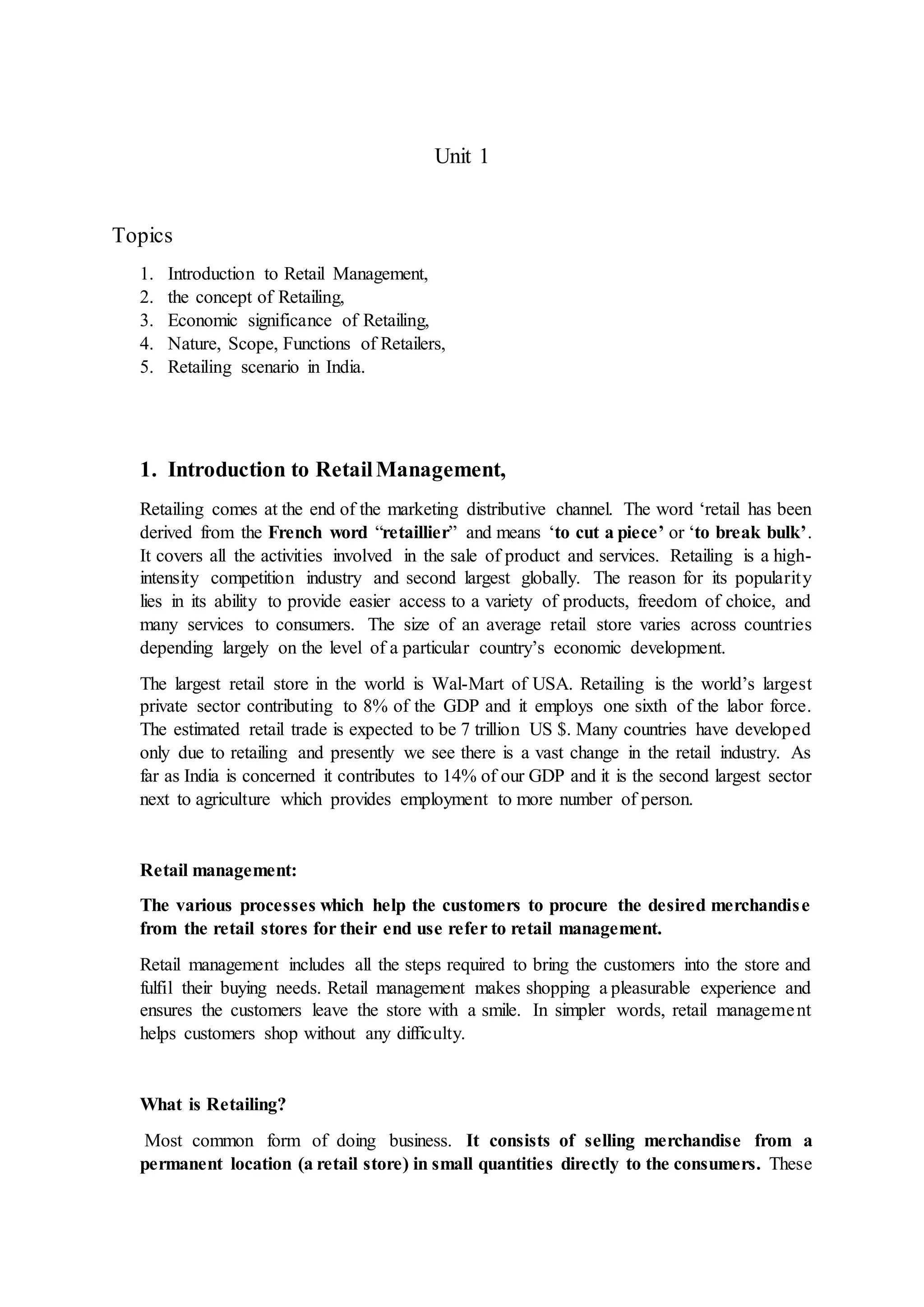 This document discusses retail concepts and practices. It covers several topics related to retail management including the concept of retailing, types of retailers like department stores and convenience stores, and retail formats such as stores, catalogs, and internet. It also discusses the importance of retailing in shaping lifestyles and contributing to the economy. Retailing is an important industry that involves the sale of goods and services to consumers.