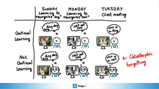 This presentation provides an introduction to continual learning, including definitions of key terms, challenges, and potential solutions. It defines continual learning as learning sequentially while avoiding forgetting previously learned classes without access to old data. The main challenge is catastrophic forgetting. Proposed solutions include memory/rehearsal techniques, regularization methods, architectural approaches, and meta-learning. Benchmarks are discussed to evaluate how well methods work, with most real-world applications prioritizing performance, speed, and memory constraints over continual learning abilities. Recent challenges show pretrained models and memory-based techniques have had success in industry applications.