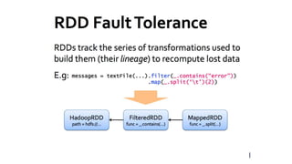 The document summarizes the foundational papers of Apache Spark, discussing its advantages over MapReduce, particularly in applications requiring iterative data processing. It introduces the concept of Resilient Distributed Datasets (RDDs) for fault-tolerant in-memory computing and explains their operations, lazy transformations, and the significance of data lineage. It further details job scheduling, dependency management, shared variables like broadcast and accumulators, and debuggability with RDDs.