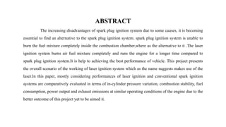 This document presents a study comparing laser ignition systems to traditional spark plug ignition systems in automotive engines. The laser ignition system offers several advantages, including complete combustion of the air-fuel mixture, lower emissions, and flexibility in ignition location, potentially revolutionizing engine performance. Despite the higher cost of laser ignition systems compared to spark plugs, their benefits may lead to broader adoption in the future.